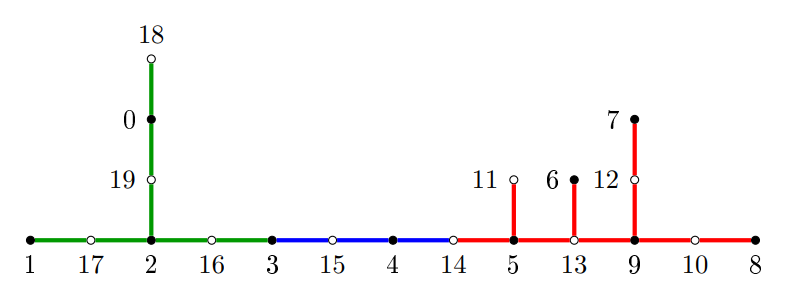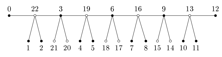 In Figure 8 we show Rosa’s \(\alpha\text{-labeling}\) of a caterpillar of order 23, where every internal vertex has degree 4. The weight on the “horizontal” edges form an arithmetic progression of difference 3, while on the \(\alpha\text{-labeling}\) of the path shown in Figure 1, the difference is 1.