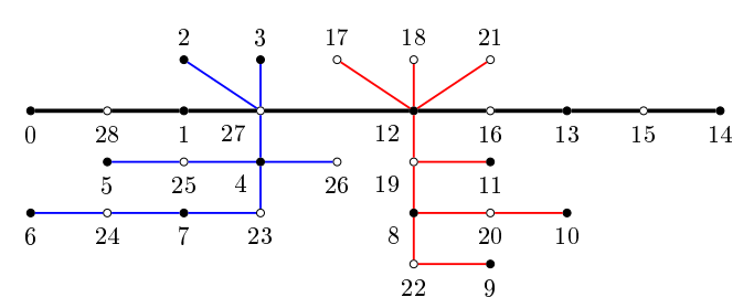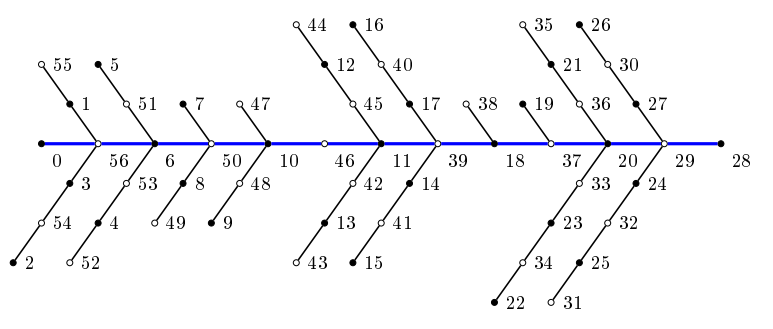 A weak aspect of this type of construction is that, sometimes, is not easy to determine whether a given tree can be built, following the steps of the construction. Among the trees that can be constructed, with the technique presented in Theorem 2.4, we have a class of trees of maximum degree 4. We say that a tree \(T,\) with maximum degree 4, is a fishbone tree if there is a path in \(T\) containing all vertices of degree larger than 2. In other terms, a fishbone tree is obtained by amalgamating vertices of a path (the spine) with vertices of other paths. In Figure 9 we show an \(\alpha\text{-labeling}\) of a fishbone tree of size 56, where the spine is the horizontal path. In [7], Rosa proved that there exists an \(\alpha\text{-labeling}\) of \(P_n\) that assigns the label 0 on any vertex \(v,\) except when \(v\) is the central vertex of \(P_5.\) Thus, if \(2k\) vertices of \(P_n\) are selected, say \(v_1, v_2, \dots, v_{2k},\) such that for each odd \(i \in \{1, 2, \dots, 2k\},\) \(v_iv_{i+1} \in E(P_n),\) then any fishbone tree obtained amalgamating \(v_i\) with any vertex \(u\) of a path \(P_{r_i}\) and \(v_{i+1}\) with the vertex \(u\) of a second copy of \(P_{r_i},\) except when \(P_{r_i} \cong P_5\) and \(u\) is its central vertex.