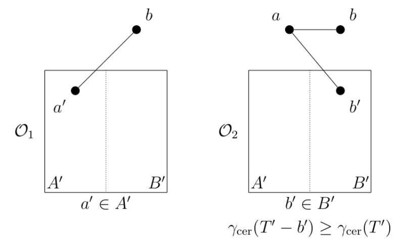 Case 1. \(T\) is obtained from \(T'\) by operation \(\mathcal{O}_1\). In this case, \((A',B' \cup \{b\})\) is the bipartition of \(T\) and \(|A'| < |B \cup \{b\}|\). Now, since \(A'\) is \(\gamma_{{\rm cer}}\)-set of \(T'\) and the attacher \(a'\) is support vertex, it follows that the set \(A'\) is a \(\gamma_{{\rm cer}}\)-set of \(T\). This proves that \(\mathcal{T} \in \mathcal{T}_{max}\).