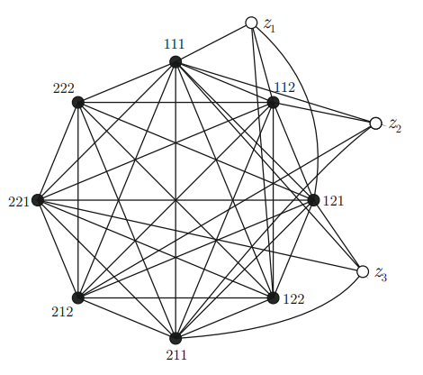 Definition 2.3. Given integers \(d\) and \(c\) with \(d\leq c\), the graph \(G^+(d,c)\) is obtained from \(G(d,c)\) by adding the vertices \(z_1,z_2,\ldots,z_c\) and, for every \(i=1,2,\ldots,c\), the vertices \(z_i\) are adjacent to all vertices \(x=x_1x_2\ldots x_c\) with \(x_i=1\).