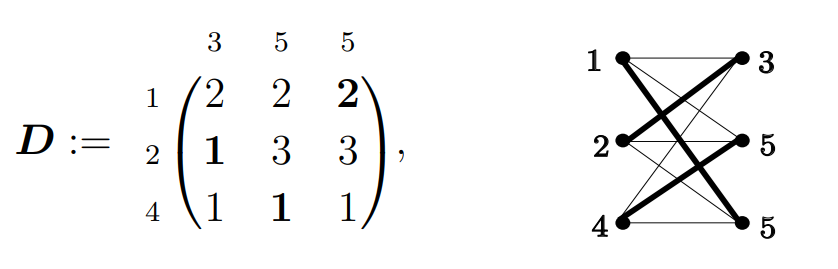 (c) Define a distance \(n'\times n'\) matrix \(\mbox{ $D$}\) with rows and columns indexed by the entries of \(\mbox{ $x$}'\) and \(\mbox{ $y$}'\) respectively, and entries \((\mbox{ $D$})_{i_{\ell} j_h}=\mathop{\mathrm{dist}}_G(i_{\ell}, j_h)\). (This matrix represents a weighted complete bipartite graph \(K^*_{n',n'}\), where the edge \(\{i_{\ell},j_h\}\) has weight \(\mathop{\mathrm{dist}}_G(i_{\ell},j_h)\)).