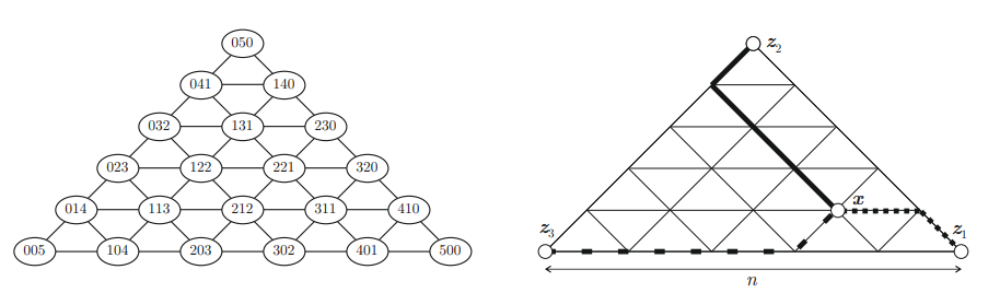 Example 3.10. The distance matrix of the complete graph \(K_n\) coincides with its adjacency matrix \(\mbox{ $D$}=\mbox{ $A$}=\mathop{\mathrm{circ}}(0,1,1,\ldots,1)\), with inverse \(\mbox{ $D$}^{-1}=\frac{1}{n-1}\mathop{\mathrm{circ}}(2-n,1,1,\ldots,1)\). Then, in the graph \({\cal F}_3(K_5)\) of Figure 2 (left), we show that the vector \(\mbox{ $\rho$}=(2,4,4)\) is feasible since \(\mbox{ $\rho$}\mbox{ $D$}^{-1}=(3,1,1)\) corresponds indeed to a vertex of \({\cal F}_3(K_5)\), see again Figure 2 (left). In contrast, the vector \(\rho=(1,3,3)\) is not feasible since \(\mbox{ $\rho$}\mbox{ $D$}^{-1}=\frac{1}{2}(5,1,1)\), which is not a vertex of \({\cal F}_3(K_5)\).