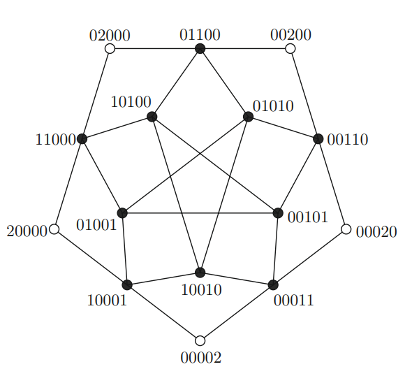 Example 4.5. Consider the graph \(G=C_5\) and its supertoken graph \({\cal F}_2(C_5)\) (the latter is represented in Figure 3). One can check that \(\dim(C_5)=2\), whereas \(\dim({\cal F}_2(C_5))=4\). The distance matrix of \(C_5\) is the following circulant matrix: \[\mbox{ $D$}=\mathop{\mathrm{circ}}(0,1,2,2,1)=\left( \begin{array}{ccccc} 0 & 1 & 2 & 2 & 1\\ 1 & 0 & 1 & 2 & 2\\ 2 & 1 & 0 & 1 & 2\\ 2 & 2 & 1 & 0 & 1\\ 1 & 2 & 2 & 1 & 0 \end{array} \right).\]