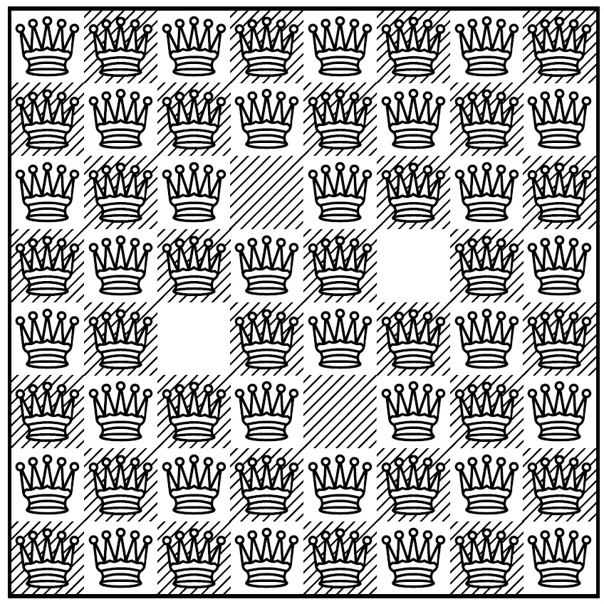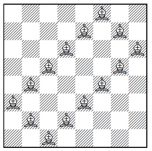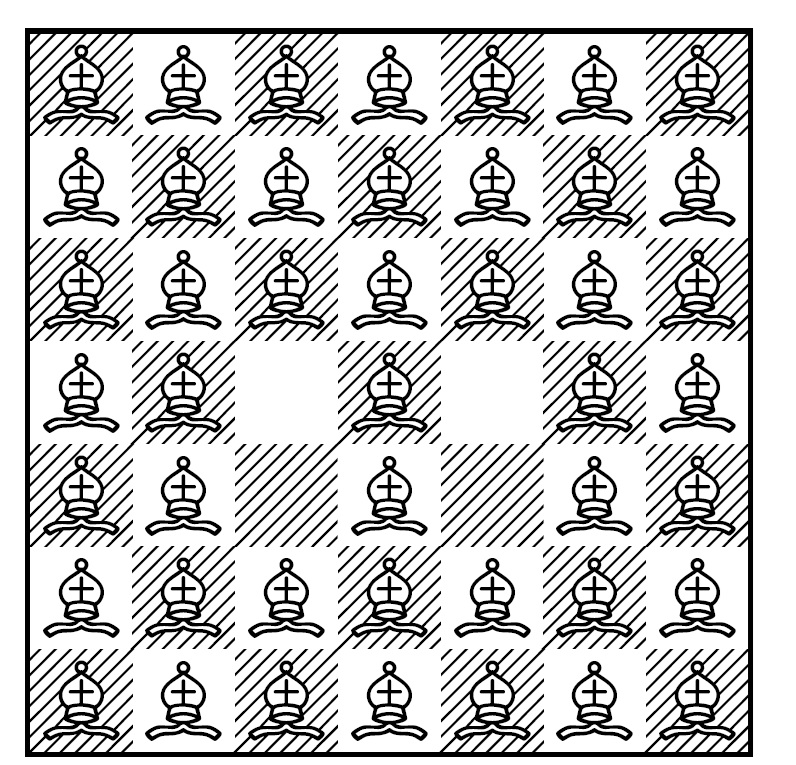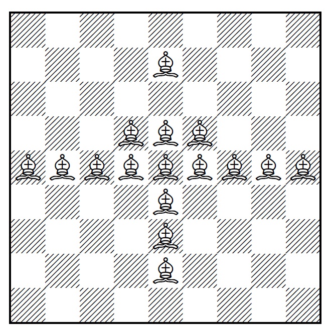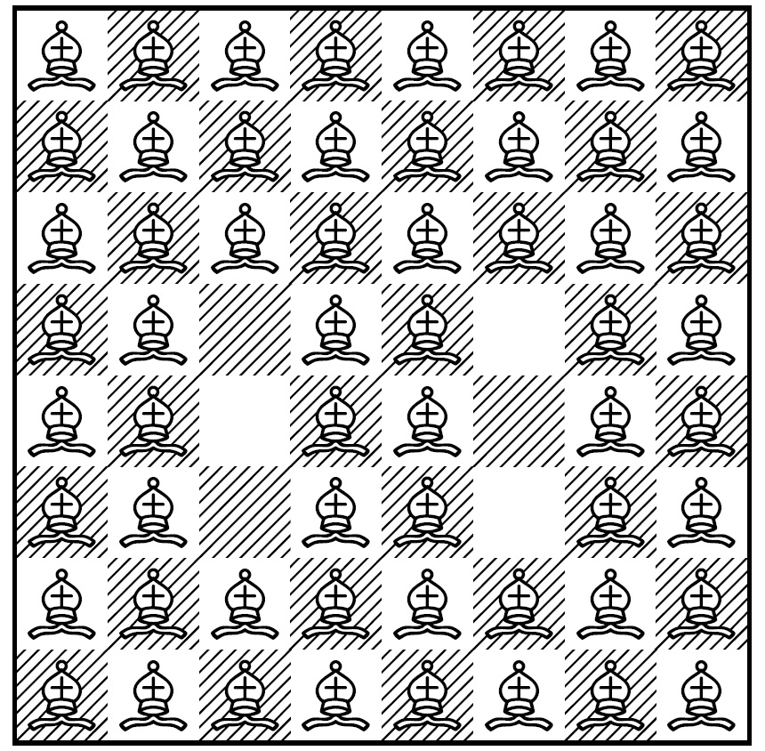 For the count on the number of bishops, note that a row or column each has \(n\) squares in them. Thus, since the upper left square of the board is counted twice in the empty row and column, we have exactly \(n^2-2n+1\) bishops in our formation. ◻