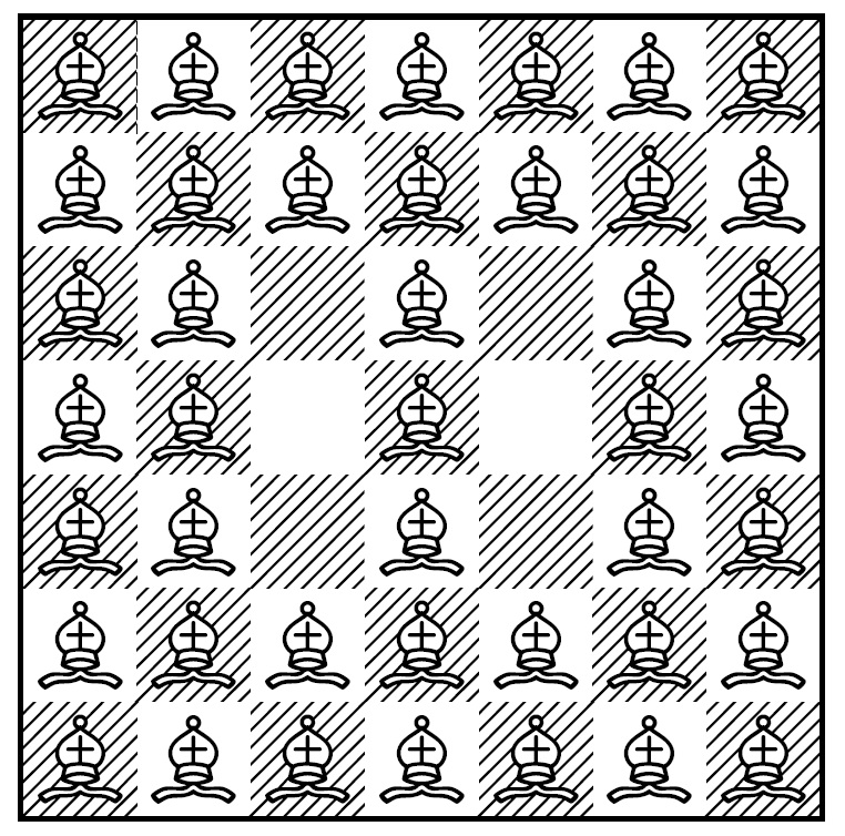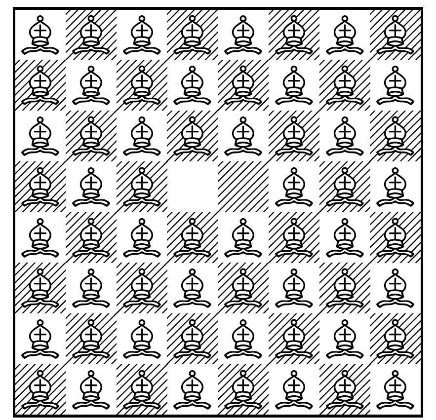 Proof. First, consider a formation of bishops with every square occupied except two of the four central squares. We leave unoccupied two central squares that are nonadjacent. Figure 3, below, illustrates one such formation of bishops for a \(8 \times 8\) board.