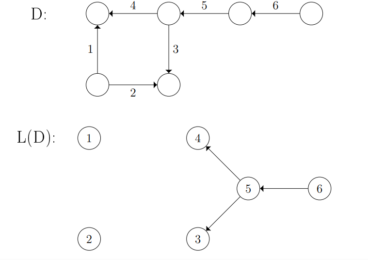 Given a digraph \(D\), its line digraph is a digraph \(L(D)\) with the vertex set \(V(L(D))=A(D)\) and the arc set \[A(L(D))=\{(\alpha,\beta)\in A(D)\times A(D):\alpha=(a,b),\beta=(b,c)\ \text{for}\ a,b,c\in V(D)\}.\]