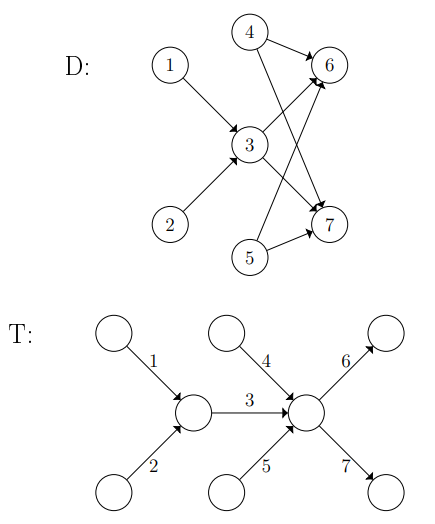 Example 3.2. Consider a digraph \(D\) with the vertex set \(V(D)=\{1,\dots,7\}\) and the arc set \(A(D)=\{(1,3),(2,3),(3,6),(3,7),(4,6),(4,7),(5,6),(5,7)\}\) (see Figure 2). Then \(D\) is a line digraph with improper partitions being \(A_1 = \{1, 2\}\), \(B_1 = \{3\}\), \(A_2 = \{3, 4, 5\}\), \(B_2 = \{6, 7\}\), \(A_3 = \{6, 7\}\), \(B_3 = \{1, 2, 4, 5\}\). Also, \(D\) contains three polycycles (\(4 – 6 – 3 – 7 – 4\), \(4 – 6 – 5 – 7 – 4\), and \(3 – 6 – 5 – 7 – 3\)), all of which are bipartite subgraphs. We conclude that \(D\) is a line digraph of a polytree \(T\) (depicted in Figure 2).
