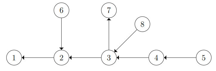 Example 3.10. Consider a tree \(X\) with the vertex set \(V(X)=\{1,\dots,8\}\) and the edge set \(E(X)=\{12,23,26,34,37,38,45,56\}\). Consider a partition of \(\mathop{\mathrm{Leaf}}(X)=\{1,5,6,7,8\}\) into two sets \(A=\{5,6,8\}\) and \(B=\{1,7\}\). We have that \(C:=\mathop{\mathrm{Conv}}_{X}(B)=\{1,2,3,7\}\). Fix a vertex \(x_{0}=8\in A\) and orient \(X\) as in proof of Proposition 3.9: the subtree \(X[C]\) is oriented as an out-tree from the root \(\mathop{\mathrm{pr}}_{C}(x_{0})=3\) and other edges are oriented towards \(X[C]\) (see Figure 4). It is clear that the sources of this orientation are exactly the vertices from \(A\) and the sinks are the vertices from \(B\).