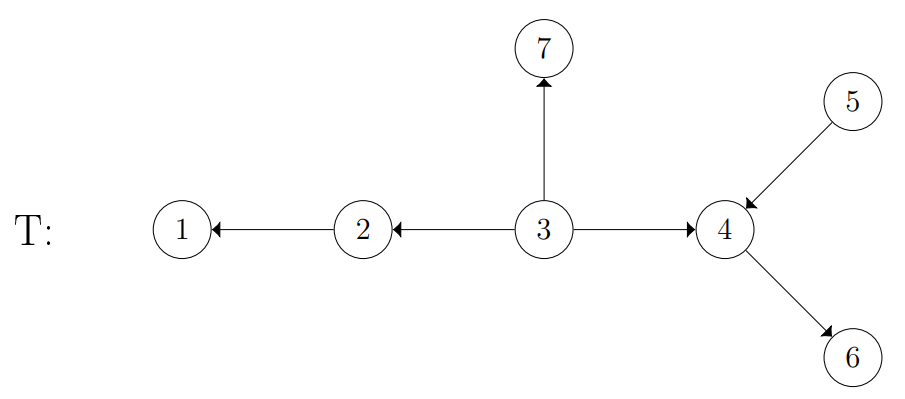 Example 3.15. Consider a tree \(X\) with \(V(X)=\{1,\dots,7\}\), \(E(X)=\{12,23,34,37,45,46\}\) and its orientation \(T\) depicted in Figure 5.