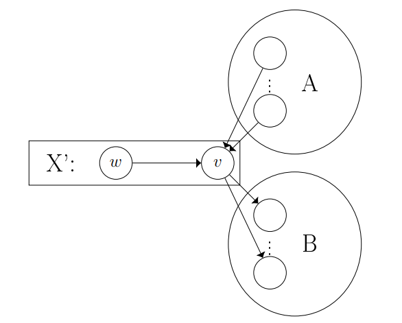 Now we only need to show that there are no other sources or sinks in \(T\). Indeed, since \(T[C]\) is an out-tree, any non-leaf vertex in \(X[C]\) is not a source nor a sink in \(T\). Also, the minimality of \(C\) implies \(\mathop{\mathrm{Leaf}}(X[C])=B\), thus no element of \(C \backslash B\) can be a source or a sink. Finally, assume that \(y\in V(X)\backslash(C\cup A)\). Then \(y\) has two neighbors \(u,v\in N_{X}(y)\) with \(y\in[u,\mathop{\mathrm{pr}}_{C}(u)]_{X}\) and \(v\in[y,\mathop{\mathrm{pr}}_{C}(y)]_{X}\). By construction, \((u,y),(y,v)\in A(T)\) implying that \(y\) also is not a source nor a sink in \(T\). ◻