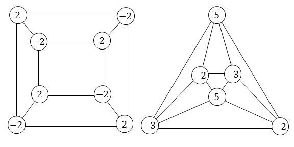 Not only is the wheel an example of a \(3\)-connected simple plane graph, but all \(3\)-connected plane graphs are simple. To verify this claim, suppose we have a plane graph that has parallel edges between vertices \(u\) and \(v\). Then the vertices \(u\) and \(v\) form a vertex cut. Thus, \(3\)-connected plane graphs are necessarily simple. Such graphs are interesting due not only to their high connectivity, but because the dual \(G^*\) of a \(3\)-connected plane graph \(G\) is also a \(3\)-connected plane graph, and therefore both graphs are simple. Now, we already know that all \(3\)-connected cubic plane graphs are strong \(\mathbb{Z}_3\)-zonal. We demonstrate two additional \(3\)-connected plane graphs which are strong \(\mathbb{Z}_4\oplus\mathbb{Z}_4\)– and \(\mathbb{Z}_5\)– zonal in Figure 7.