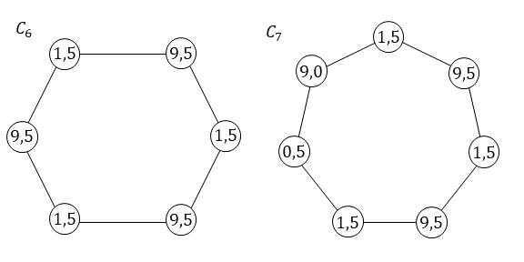 In Figure 1 we give examples of \(\Gamma\)-zonal labelings of \(C_6\) and \(C_7\). Next we turn to another simple class of graphs. Let \(W_n\) denote the wheel \(C_n \vee K_1.\) The wheel is interesting as it is self-dual; therefore we may explore the concepts of \(\Gamma\)-zonality and \(\Gamma\)-cozonality simultaneously. It was shown in [4] that \(W_n\) is zonal (and therefore cozonal) if and only if \(n\equiv 0 \pmod 3.\) However, by changing our group \(\Gamma\) we are able to obtain \(\Gamma\)-zonal labelings of \(W_n\). In fact, we can obtain a complete characterization. We will divide this characterization into two parts based on the parity of \(n\).
