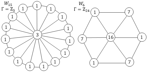 These are certainly not the only groups for which even wheels are generative \(\Gamma\)-zonal by Theorem 3.6. Nevertheless, this demonstrates that the parity of \(n\) in the wheel \(W_n\) determines whether or not \(W_n\) is generative \(\Gamma\)-zonal for a finite or infinite number of non-isomorphic abelian groups \(\Gamma\). We end this section with two examples of generative \(\Gamma\)-zonal labelings of wheels in Figure 3.