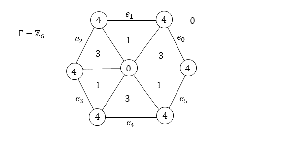 Thus, there are a finite number of groups (up to isomorphism) for which a given odd wheel is generative \(\Gamma\)-zonal. The case for even wheels doesn’t appear to be much different, but it is in fact much more flexible. In this case there are only two different labels \(g_1\) and \(g_2\) on the boundary of the outer cycle, and the central vertex is assigned the label \(-(g_1+g_2)\), which is generated by \(g_1\) and \(g_2.\) We also require that the order of \(g_1+g_2\) divides the order of \(n/2.\) This can be summarized as follows: