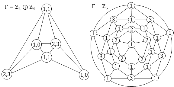 In the study of zonal (and cozonal) labelings where our group is \(\mathbb{Z}_3\), we use \(\bar \ell\) to refer to the complimentary labeling defined by the relation \(\bar \ell(v) =2\ell(v)\). We see that Observation 2.2 generalizes complimentary labelings. However, there is one difference. In the case of zonal labeling, we can use complimentary labelings to assume without loss of generality that in a zonal labeling \(\ell\) the label of a certain vertex \(v\) is \(1\). This is because if \(\ell(v)=2\), we simply take the complimentary labeling to obtain a zonal labeling where the label is \(1\) instead. If our group is for instance \(\mathbb{Z}_4\), we cannot make such an assumption. As an example, there is no endomorphism \(\varphi\) such that \(\varphi(2)=1.\) Alternatively, an endomorphism that maps \(\varphi(1)=2\) may map some other labels to \(0\), resulting in a labeling which is not \(\mathbb{Z}_4\)-zonal. While automorphisms of \(\Gamma\) can be used to reduce the number of possible labels of a vertex, we cannot generally make the assumption that a single vertex has a specific label.