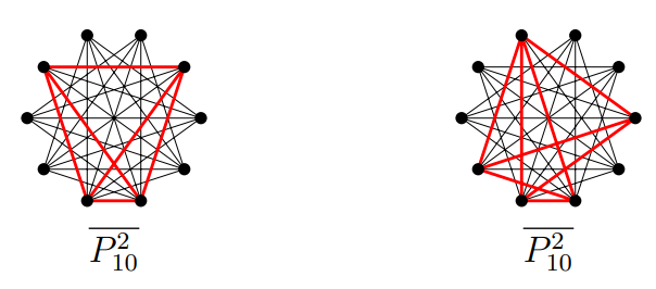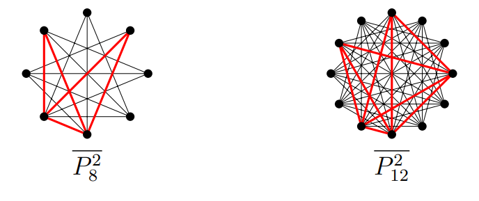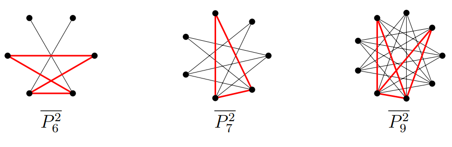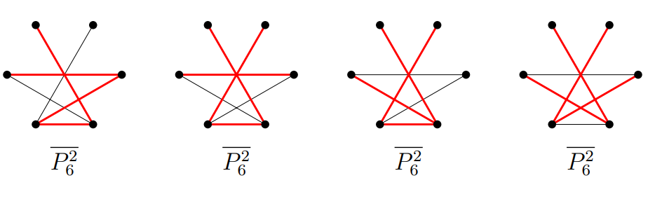Proof of of Theorem 1.1. Let \(n\geqslant 6\) and \(t = \left\lfloor{n}/{4}\right\rfloor\). Let \(F\) be an \(n\)-vertex graph with at most \(n – 2\) edges. Since \(\bigtriangleup (\overline{P^2_{n}}) =n-3\), \(P^2_{n}\) does not pack with \(S_{n-1}\). In any packing of \(P^2_{n}\) with \(S_{n-2}\), \(\overline{P^2_{n}} – S_{n-2}\) are two isolated vertices. So \(P^2_{n}\) does not pack with \(S_{n-2}\cup K_2\). Figures 1 and 2 clearly show that \(P^2_{n}\) does not pack with the graph in \(\mathcal{H}^*_{n}\setminus \{S_{n-1}, S_{n-2}\cup K_2\}\) for \(n=6,7,8,9,12\).