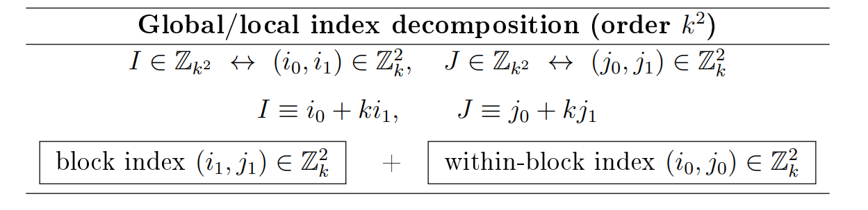Definition 2.14(Block digits for indices in \(\mathbb{Z}_{k^2}\)).For \(I\in\mathbb{Z}_{k^2}\), define its digits \((i_0,i_1)\in\mathbb{Z}_k^2\) by the unique decomposition \[I \equiv i_0 + k i_1 \pmod{k^2} \qquad\text{with } i_0,i_1\in\{0,1,\dots,k-1\}.\]