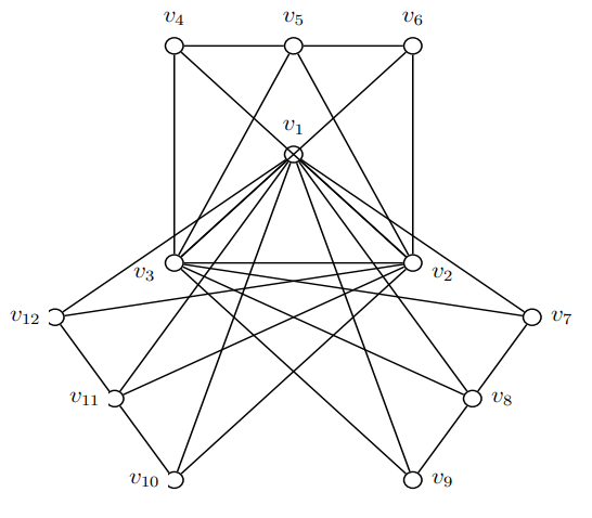 Proof. Let \(\{v_{i};1\le i\le n_{1}\}\) be the vertices of \(G_{1}\) and let \(v_{i}, v_{j}\) for any \(i,j;1\le i,j\le n_{1};i\ne j\) be the two universal vertices. Observe that every vertex of each copy of \(G_{2}\) is adjacent to two universal vertices of \(G_{1}\) in \(G_{1}\star G_{2}\). But the vertices in the copy of \(G_{2}\) with respect to the universal vertices are adjacent to only one vertex of \(G_{1}\). Note that every vertex of \(G_{1}\star G_{2}\) are dominated at least twice by the universal vertices itself but the vertices in the copy of \(G_{2}\) with respect to the two universal vertices are dominated only once by the universal vertices. Consider the set \(S=\{v_{i},v_{j},v_{k};1\le i,j,k\le n_{1};i\ne j\ne k\}\) where \(v_{i}\) and \(v_{j}\) are two universal vertices and \(v_{k}\) is any vertex of \(G_{1}\) which is included in \(S\) to double dominate the vertices in the copy of \(G_{2}\) with respect to the universal vertices. This set dominates every vertex of \(G_{1}\star G_{2}\) at least twice. Therefore, \(S\) is a double dominating set of \(G_{1}\star G_{2}\) which is minimum. Hence, \(\gamma_{2\times}(G_{1}\star G_{2})=|S|=3\). ◻