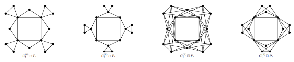 Let \(G_1\) and \(G_2\) be two vertex disjoint graphs. The \(R\)-vertex corona of \(G_1\) and \(G_2\), denoted by \(G^{(R)}_1 \odot G_2\), is the graph obtained from vertex disjoint \(R(G_1)\) and \(V(G_1)\) copies of \(G_2\) by joining the \(i^{th}\) vertex of \(G_1\) to every vertex in the \(i^{th}\) copy of \(G_2\) . The \(R\)-edge corona of \(G_1\) and \(G_2\), denoted by \(G^{(R)}_1 \circleddash G_2\), is the graph obtained from vertex disjoint \(R(G_1)\) and \(I(G_1)\) copies of \(G_2\) by joining the \(i^{th}\) vertex of \(I(G_1)\) to every vertex in the \(i^{th}\) copy of \(G_2\), where \(I(G_1) = V(R(G_1)) -V(G_1)\). The \(R\)-vertex neighborhood corona of \(G_1\) and \(G_2\), denoted by \(G^{(R)}_1 \boxdot G_2\), is the graph obtained from vertex disjoint \(R(G_1)\) and \(V(G_1)\) copies of \(G_2\) by joining the neighbors of the \(i^{th}\) vertex of \(G_1\) in \(R(G_1)\) to every vertex in the \(i^{th}\) copy of \(G_2\). The \(R\)-edge neighborhood corona of \(G_1\) and \(G_2\), denoted by \(G^{(R)}_1 \boxminus G_2\), is the graph obtained from vertex disjoint \(R(G_1)\) and \(I(G_1)\) copies of \(G_2\) by joining the neighbors of the \(i^{th}\) vertex of \(I(G_1)\) in \(R(G_1)\) to every vertex in the \(i^{th}\) copy of \(G_2\). Figure 8 show the examples of R-vertex corona, R-edge corona, R-vertex neighbourhood corona, R-edge neighbourhood corona of graphs \(C_4\) and \(P_2\).