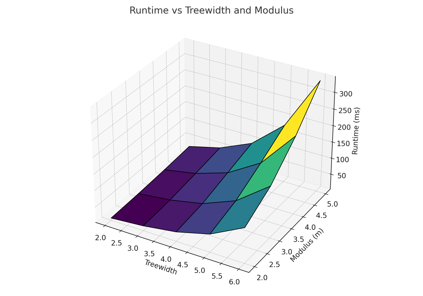 Exponential Growth: Runtime exhibits clear exponential growth in both treewidth and modulus, consistent with the \((2m)^{2\text{tw}+2}\) bound.
