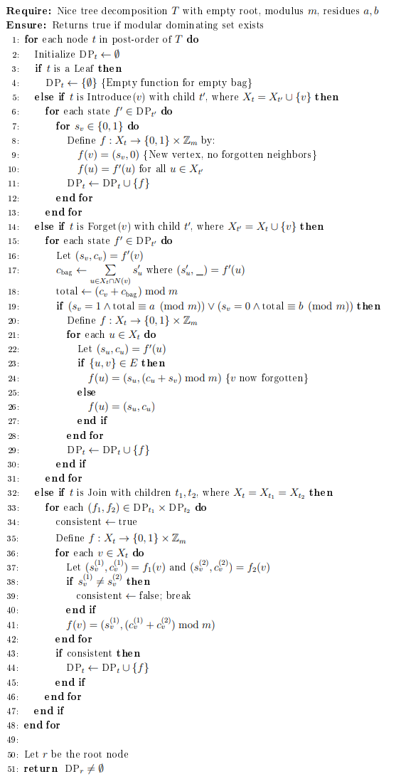 For finite or cofinite \(\sigma, \rho\), dynamic programming (DP) on a tree decomposition of width \(\text{tw}\) yields fixed-parameter tractable (FPT) algorithms running in time \(f(\text{tw}) \cdot n^{O(1)}\) [7]. However, in the modular setting, standard DP must maintain explicit counts modulo \(m\) for each vertex in every bag, resulting in \(O((2m)^{\text{tw}+1})\) states. This exponential blow-up in both \(\text{tw}\) and \(\log m\) renders naive approaches impractical.