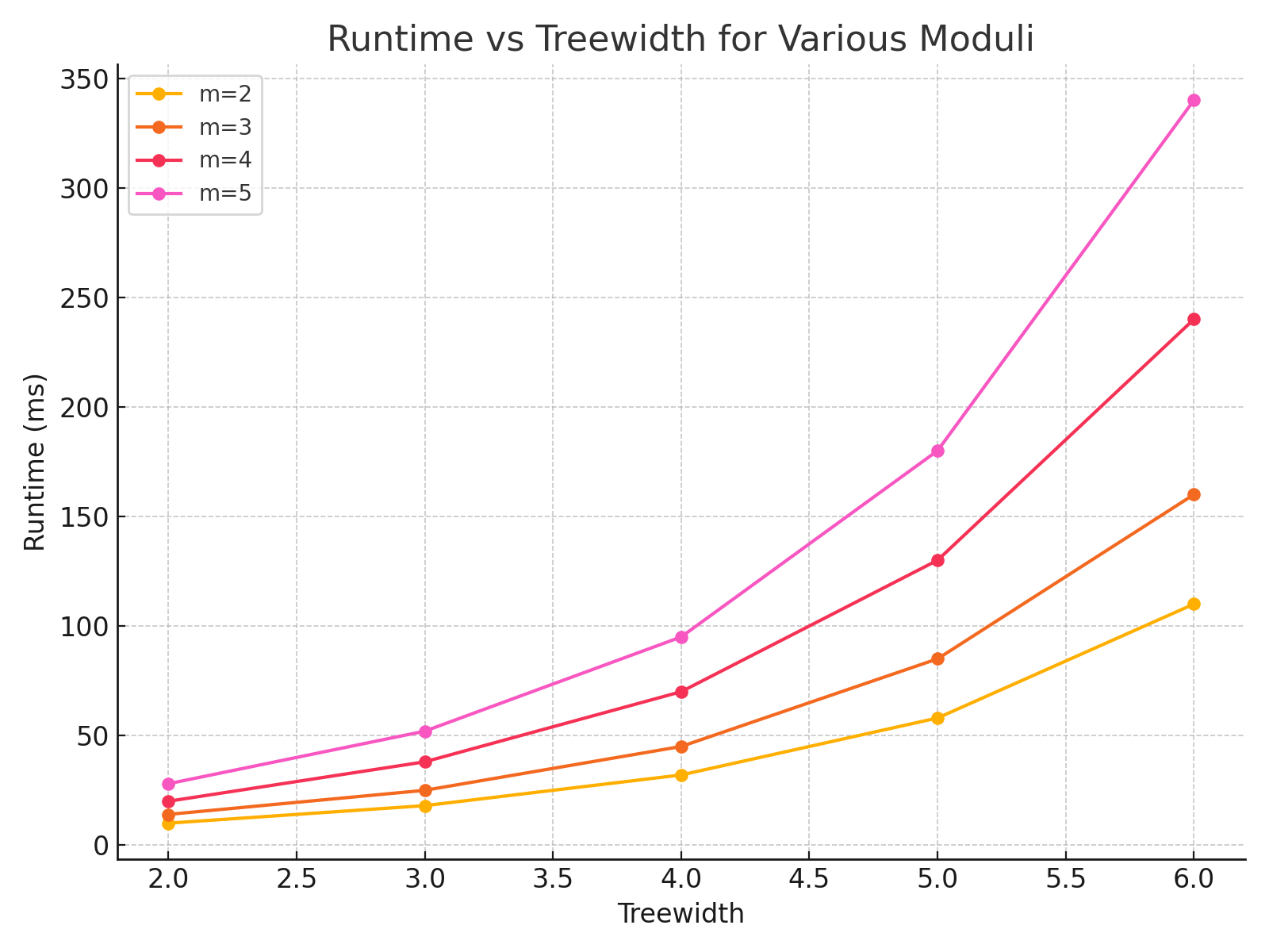 Notably, the gap between \(m=2\) and \(m=5\) widens with increasing \(\mathrm{tw}\), illustrating the compounding interaction of the two parameters. This suggests that while small moduli can be handled efficiently even for moderate \(\mathrm{tw}\), larger moduli exacerbate the combinatorial explosion.