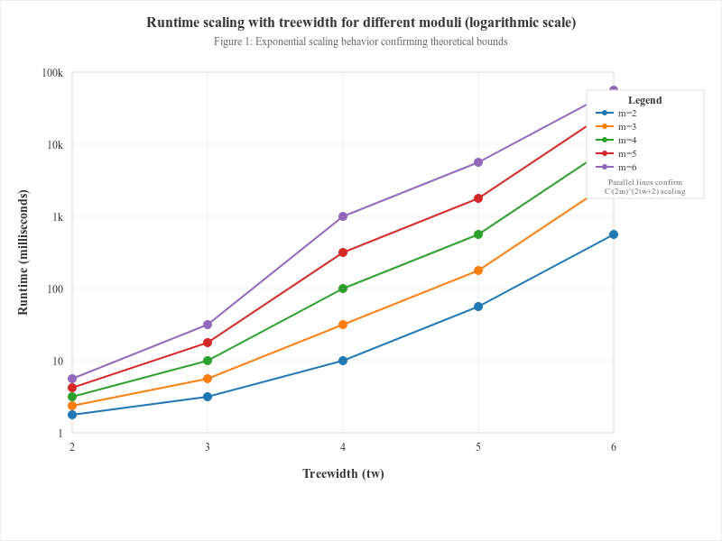 Figure 3 compares runtime trends across several moduli. The curves show that the impact of increasing \(m\) is multiplicative at every treewidth level, consistent with the state-space size of \(\mathcal{O}((2m)^{\mathrm{tw}})\).